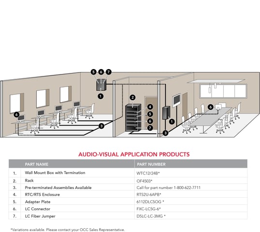 OCC provides all the end-to-end cabling and connectivity pieces and parts to streamline the most reliable high-bandwidth, high-speed network. See below for an example of OCC's audiovisual solution: