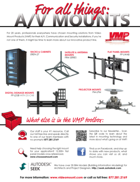 Video Mount Products (VMP) is a leading provider of mounting solutions for the A/V, communication and security industries since 1994. VMP products consistently offer the latest designs in safety and flexibility, all at an outstanding value. VMP's product offering continues to grow by adding mounting systems to address growing segments across many markets.